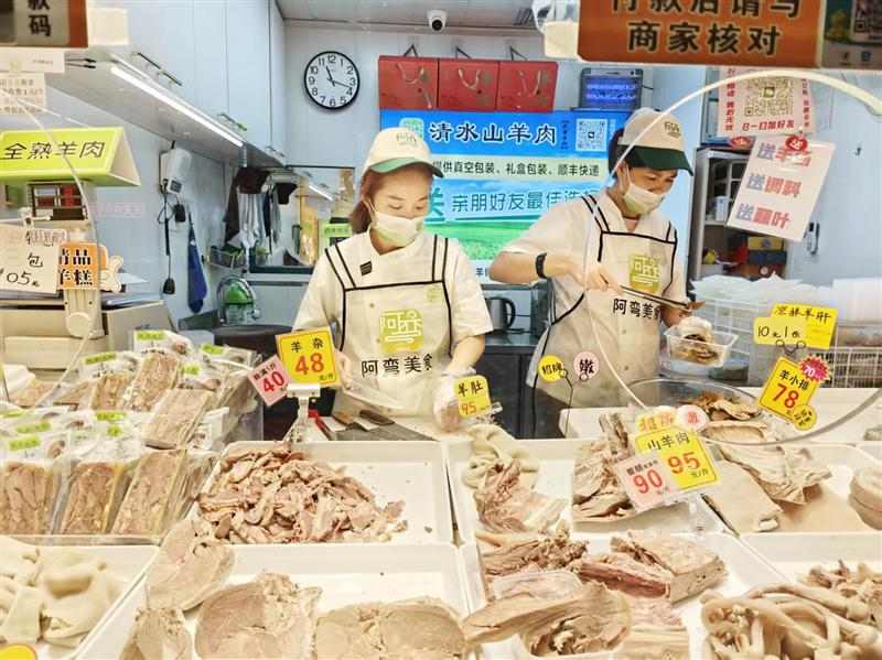 此外,方便快捷的熟食羊肉也成为不少市民的选择。在朝阳农贸市场熟食区,羊肉类产品种类丰富,价格也因部位与工艺不同而有所区分:熟切羊杂售价为48元/斤,羊肚和山羊肉售价达95元/斤,羊小排售价为78元/斤。这类产品以其“即买即食”的特性,吸引了不少工作繁忙或不会处理生肉的消费者购买。