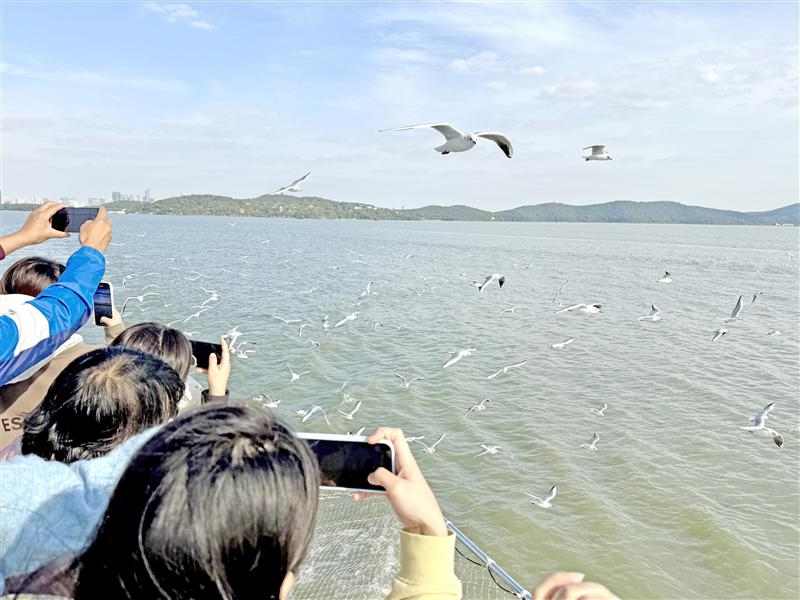 “快看,红嘴鸥来了!”昨天(11月3日)上午,鼋头渚景区码头边,一阵呼喊声打破了太湖的宁静。数十只身披雪白羽毛的红嘴鸥盘旋在游船周围,不时发出叫声,灵动的身影在碧波间穿梭。这标志着今年首批红嘴鸥正式抵达无锡。这群“远方来客”让游客瞬间沸腾,今年无锡的“红嘴鸥季”就此拉开序幕。