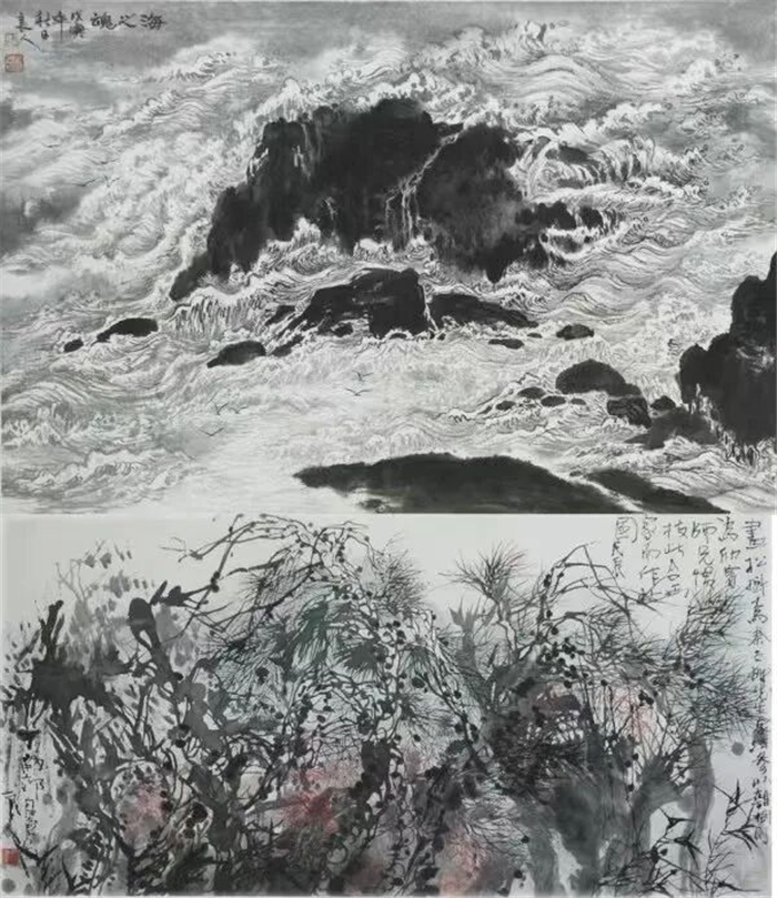 人都是有思乡情结的。年事已高后,王良人对童年的生活十分怀恋,每每忆及,倍感亲切,他要用手中的笔墨来反映这些生活。于是,就构成了他的第三类山水画作品。他画了许多大海题材的作品,如《海岸惊涛》《出航图》《东山日出图》《海之魂》等。以《海之魂》为例,它在构图上不走常规路,极富创新性:把焦黑的海礁放在画面中央,四周波涛汹涌,浪花似雪,以无坚不摧的威力肆虐着,扑向耸立在海中央的焦黑海礁,海礁却巍然屹立,造成了强烈的视觉冲击,从而充分表达和体现出与题目相对应的象征意义。对于这些画,钱绍武先生评论:“良人画了那么多的大海,朝晦夕阴,气象万千,国画中很少有人画大海,他走出了一条新路。”