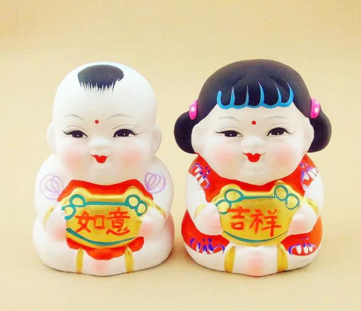 据传早年惠山中有一种妖孽时常会下山为害,关键时刻就会有一个像小孩子的圣者出现,他奋力驱妖除孽,维护着一方平安,于是惠山居民就将其塑成像并取名大阿福。那笑眯眯的光脚小男孩,身着兜肚露出肉肉的身段,颈和腰都被艺术化地缩减了,他手中抱着一只狗非狗狮非狮的兽,那就是传说中的妖孽,长相有点凶猛的妖孽此时被阿福收入怀抱,变得驯顺,把大阿福的塑像供在家里可驱灾避凶,迎祥纳富。大概是怕阿福孤单,艺人又设计出与之相仿的女孩阿喜,使之成双成对地出现在案上以增加家庭的祥瑞之气。阿福阿喜怀中的抱物也伴随着时代发展经常变化着,如鲤鱼、玉兔、仙桃或成捆稻穗,显得越发喜庆而富有时代新意。