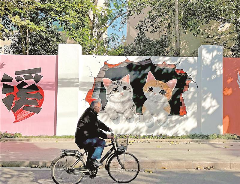近日,梁溪区曹张路上一段临街围墙披上了艺术彩绘新装。从梁溪区城管局了解到,不仅曹张路,古运河(东门段)滨水步道、北仓门生活艺术中心等地均有别具一格的墙绘。(施剑平 摄)