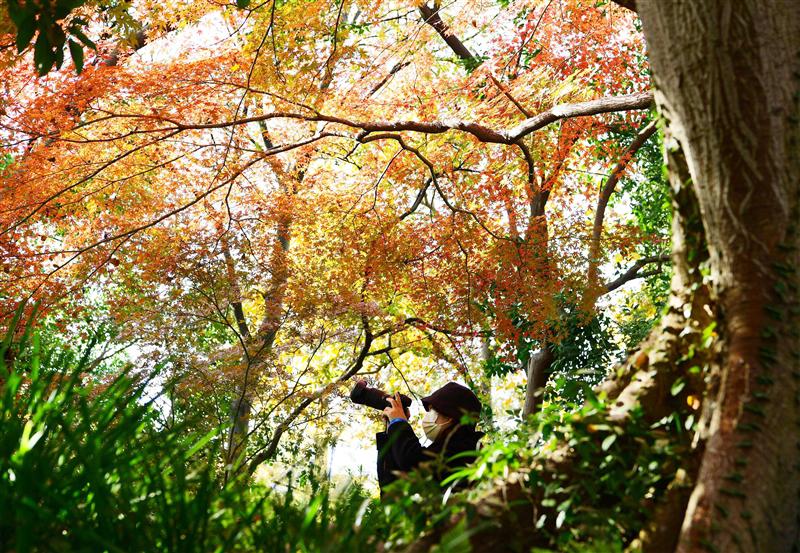 11月25日,市民在惠山古镇赏景拍照。初冬时节,惠山古镇内层林尽染,景美如画。