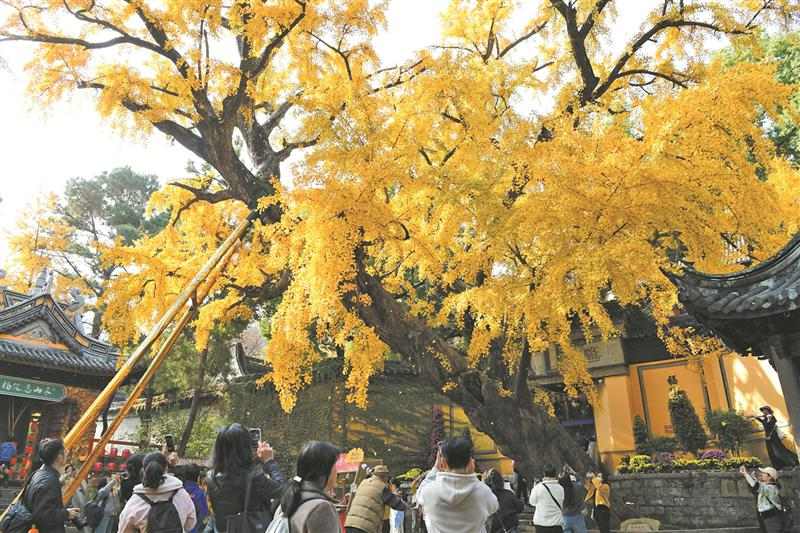 12月1日,人们在古银杏树下拍照打卡。眼下,惠山古镇惠山寺的古银杏已进入最佳观赏期,吸引市民和游客前往观赏、拍照。(还月亮 摄)